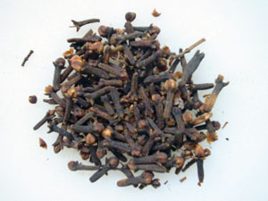 花が開くと芳香が失われるので、開花直前のツボミをガクと共につみ取って乾燥させたものがスパイスとして使われる。 乾燥させると重量は初めの3分の1になる。 原産地はインドネシアのモルッカ諸島。 古くから中国商人の手でヨーロッパに持ち込まれ、強力な殺菌・消臭作用で注目された。 紀元前4世紀には、すでにアリストテレスがクローブの蒸留法を記述しており、古くからこの植物の薬効が知られていたことがわかる。 大航海時代にはスパイス貿易の中心的な商品の一つであった。 16世紀にはポルトガルがモルッカ諸島のクローブを独占したが、イギリスとオランダが、巨万の富を生むスパイス(クローブやナツメッグ)交易を巡り熾烈な争いをした。 これが新航路発見のきっかけとなったスパイス戦争で、17世紀、ポルトガルを駆逐したオランダは、クローブの栽培をアンボン島に限定した。 しかし、18世紀には、フランス人が密かに東アフリカのセイシェル島、モーリシャス島などに移植して栽培が始められた。 現在では、タンザニアのペンバ島とザンジバル島が生産量のほとんどを占め、その他、マダガスカル、モーリシャス島、スリランカ、マレーシア、インドネシア、西インド諸島などで栽培されている。 インドや中国では紀元前から殺菌・消炎・消臭に利用されていた。 ヨーロッパには中国商人が絹などと共にセイロン経由でもたらし、 6~7世紀頃には王侯貴族の間に知られるようになった。 古代中国では臣下が皇帝の前に出るときにはクローブを口に含んだという記録がある。 その強い香気は洋の東西を問わず珍重され、日本にもかなり古く、5~6世紀には紹介されていたようで、正倉院の宝物のなかにも当時輸入された丁子があり、源氏物語にも丁子の記述がある。 特徴的な香気成分はオイゲノール。 クローブはあらゆるスパイス類の中でも精油の割合が高く、約20%ある。 香りが最も効率的に抽出されるのは45度前後。 ゴキブリがこの香りを嫌うのでゴキブリ除けとしても使用されることがある。 またクローブの精油(丁子油)は日本刀のさび止めにも用いられた。 生薬としての花蕾を丁子(ちょうじ)または丁香(ちょうこう)ということもあり、芳香健胃剤である。 日本人にも案外なじみ深く、江戸時代から ビンツケ油や匂い袋の香料として使われた。 クローブをオレンジやレモンなどの柑橘類に刺して乾燥させた物をフルーツ・ポマンダーと言い、 部屋や洋服ダンスの消臭・防虫に使われることもある。 アーユルヴェーダでは、香辛料としてカレー料理やチャイなどに広く用いられている。 クローブを使った サフランライスのレシピ チャイの作り方はこちら |