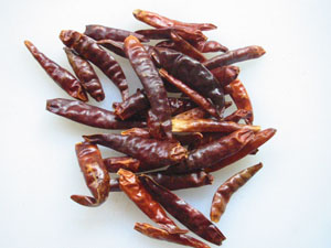インドではチリ、英語ではチリ・ペッパーと呼ばれる。 唐辛子の辛味成分はカプサイシンである。血行を良くして食欲を増進させ、発汗を促す作用がある。 そのほか、神経痛・消化不良・胃炎、腰痛・五十肩・膀胱炎に効用がある。 |