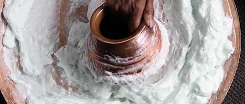 40分から50分、沸騰させつづけると、音がしずまり、沈殿物が底にはりついて焦げはじめ、ギーが黄金色になっていきます。 |