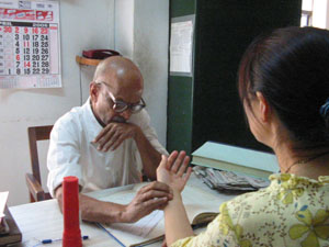 私の友人Nさんはその8年ほど前に大きな手術をして、その診断書をもって、先生のところへ見てもらいに行ったわけです。 チベットの医者も脈診しますが、アーユルヴェーダの医者も脈診します。 |