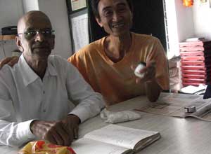 ![]() ドクター・カディワレとまじゅ、手に持っているのが「シャタ・ドルタ・グルタム」、新聞紙の上においてあるのが「沙羅双樹(さらそうじゅ)クリーム。ドクター・カルワリの診療所にて。 |