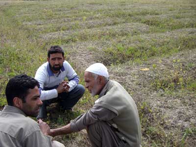 サフラン畑に坐って、マンスールとタジャムルに講義する老人。 で、私は1月か2月に種をまいて、4月に収穫するのに、なんで10月に芽が出るのか、と聞くと、老人は種をまくのは10年に一回だけだ。後は、ひとりでに10月になると芽がでてくるのだ、と言います。 なるほど、そうなのか・・・なんて思いました。 いくらで売るのか、という質問に、老人は1トラ、2,500ルピーと、言います。ということは、1gが250ルピーです。