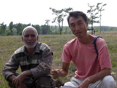 質問に答えてくれる老人。 やっぱり高いなあ、と私は思うのです。 そう言うと、老人は、「サフランは高いものだ」と答えます。 ま、それはそうですけどね。でも、ゴアと同じ値段ってことはないんじゃないの? 老人は,にこにこしていました。 あなたのサフランを買いたいが,売ってくれるか?と聞いたら、家に兄弟がいるから、そこへ行って買えばよい、と言って、マンズールさんに住所を教えました。 私たちは老人に礼を言って、また町に戻り、その住所の家に行きました。 ![]() 老人とまじゅさん、手に持っているのはサフランの枯れ草!? すると、そこには、女性が二人いて、ここはママスディールの家ではないと言います。住所はあってるけど、そんな人は知らない。と言うのです。 我々は、だんだん狐につままれたような気がしてきて、なんだかわからなくなりました。 タジャムル君は、「ママスディールというサフラン農家は、このへんにはいないのか?」と女性に聞いているようです。 すると、女性は、「ママスディールは知らないけど、サフラン農家なら一人いるわよ」と言って、我々をサモサやスィートなどを売っている店に連れて行ってくれました。 そこが、サフラン栽培農家、バシール・モハメッド・ミリのお店だったのです。 バシール・モハメッド・ミリについては、また次の章でご紹介します。 このときは、サフラン畑でみた老人がたいへん気にいってたものだから、また同じ場所に戻っていったのです。 ママバシールは、もうどこにもいませんでした。 まるで、サフラン畑のなかに忽然と消えていってしまったかのようです。 200メートルほど離れたところで仕事をしていた人たちに聞いても、だれもそんな人は知らないというのです。 その人たちが、本物のその畑の所有者だったわけですけどね。 あとから、いろいろサフランについて話を聞くと、サフランは私が思ってたように、やはり11月に花を咲かせるのです。 そうするうちに、私のなかではようやく、いろいろつじつまの合わない話やら、奇妙なできごとの連続が、だんだんはっきりとしてきたというわけですよ。 若いタジャムル君は、憤慨して、「あのジジイ、なにからなにまでみんな嘘っぱちじゃないか!」なんて、憤慨してましたが、そのころには私はこの奇妙奇天烈な出会いの意味がわかってきたのです。 たいへんありがたい、インビテーション(招待)をいただいたわけなのです。サフラン畑の精霊(スピリット)から・・・ね。