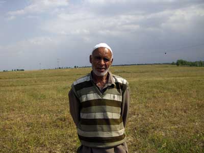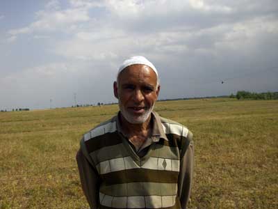 部屋から湖をながめる。 ここのご主人、シャキールさんにサフランのことを話すと、まず友人のファヤズさんを紹介してくれました。 そして、ファヤズさんがパンポレでフルーツ屋をやっている従兄弟のマンズ-ルさんと連絡を取ってくれました。 それで、翌日、私は英語の話せるタジャムル君というリキシャ・ドライバーを雇って、パンポレにやってきました。 インド・コネクション・・・、インドではこのようにしてものごとが起こっていくのです。 マンズ-ルさんのフルーツ・ショップはすぐ見つかって、今度はクルドというサフランを作る人のところに行きたい,と言うと、周りの人がみんな集まってきて、ああだ、こうだ、しゃべっていました。結局、だれもわからずに、マンズールさんがファヤズさんに電話して、それはクマールのことだと判明。クルドはクマールの愛称なのだそうです。 クマールは3軒となりでギフトショップをやっている人で、私にサフランのパックを見せてくれました。 1g、300ルピー(約700円)だと言います。 ええ!?、と私は驚きましたね。 なぜなら、この価格はムンバイやゴアで買う値段と同じだからです。 私は、カシミールまで来れば当然、産地価格で安いのだろうと思っていました。 だって、あいだに問屋とかお店とかのマージンがはいって、輸送費だってけっこうかかるだろうし・・・、ま、半分とまではいかなくても、それくらいは安いだろうと思ったわけです。 それで、「こいつ、ぼってるんちゃうんか?」と思って、あとはいい加減にあしらっておくことにしました。 いちおう、ファヤズさんやマンズールさんの手前もあるから・・・、あまり悪い言葉は使わないようにして、ね。 マンズールさんに頼んで、じゃ、サフランの畑に連れて行ってくれないか、と頼むと、いいよ、と自分の店をほったらかしにして、私たちをそこから2キロほど南に連れていきました。 一面に広がるサフランの畑でした・・・、もっともこの時期はサフランの花は咲いてないのですが、ひろびろとした大地のむこうにヒマラヤの尾根がみえて、のどかな、田園風景です。 ちょうどそこにひとりの老人がいたので、マンズールさんとタジャムル君が老人に話しかけました。