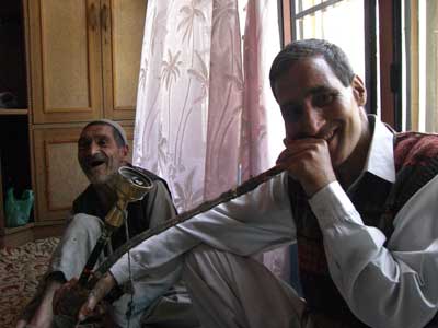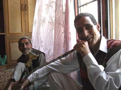 ヴィシュヌ神と妻ラーダの彫刻。エローラにもまったく同じ構図の彫刻がある。 イスラムのモスクや、15世紀に中央アジアからやってきたスーフィーの聖者のサマーディーを、私に見せてくれました。 グラム・ラスー・スーフィー。 サフランと、スーフィーの里に吹く一陣のそよ風、のような存在でしたね、私にとっては。 彼との最初の出会いは、こんな感じだったんですよ。 ![]() カシミールのタバコを吸っている。写真をとったら・・・