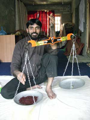 山とつまれたサフラン。 カシミールのサフランは世界一だと地元の人は言います。 ところが、価格も世界一高いので、いったんディーラーの手に入ると、あの手この手のごまかしが闊歩しているようです。 実際にサフランを作っている農家から直接買わないかぎり、本物は手にはいらない、というのが実情です。