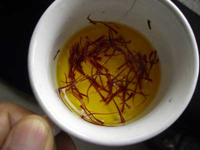 湯に入れてサフラン色にそまっても、パンポレ村のサフランはきりっとしている。 |