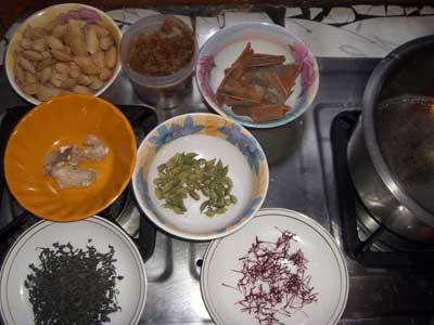 | 1 | サフラン、カルダモン、シナモンをならべて、湯を沸騰させてます。 |