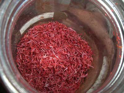 左がパキスタンからやってくるヒマラヤ・ソルト。右がブラックソルト。 その横には、ヒマラヤの岩塩がおいてありました。 白いほうはパキスタンから来るそうです。 アメジスト色のほうは、ブラック・ソルト(カラナマック)といわれて、やはりヒマラヤの山から出てきていたらしいが、最近はデリーあたりで壷にいれた塩を焼いて作るのだという風評がたっていて、ウキペディアあたりでも、そのように書いてあります。 もうヒマラヤにはなくなったのかもしれませんね。 でも、きれいな色でしょう。 私は、この色が大好きで、この塩も大好きだったんですけど・・・ま、世の中いろいろ変化していくものだから・・・ま、いいでしょう。 ところで、ここで売っているサフランは、1g40円でした。 完璧なにせもので、まるで乾燥した松の葉に赤い色をつけたようなものですが、湯に入れると、ほんものと同じような色がでてきました。わからない人には、見分けがつかないでしょうね。