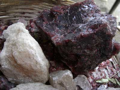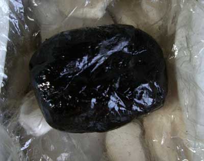 黒光りするシラジットの塊り。これで1キロくらいかな。 これが、ヒマラヤの山から里におりてくるときの姿です。 これをほんのちょっとつまんで、湯に入れて、砂糖をたして、寝るまえに飲むと、翌朝は、元気満々だ、と言ってます。 色といい、硬さ加減といい、大麻の樹脂成分に見たかんじが似ているので、間違われやすいので、残念ながら、扱うことはできませんが、これらがアーユルヴェーダの工場に行って、粉末にされ、他のハーブなどと混ぜられて、アーユルヴェーダの薬として市場に出ていくのです。