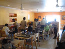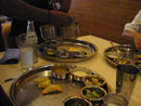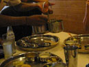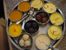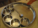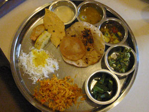 店内は清潔そうで、トイレもきれいで、第一印象はグッド! 手を洗って、席に着くと、まずスターターの2品とパパッドが来て、あとはぞくぞくと5品のサブジ(おかず)とチャパティ、プーリのパン類、2種類のご飯の白米のほうにはギーをふりかけ、ダルをかけていきました。 サブジにはスパイシーとノンスパイシーがあり、私はもちろんノンスパイシーをたのみましたが、プニさんはその両方をたのんで、けっきょく、10種類のサブジを満喫したようです。 店内はだんだんインド人の家族連れでにぎわいだし、サーブする店員たちはおおいそがしのようでした。 私は意識的にあまり食べないようにしましたが、それでも腹はかなりふくれました。 こんなターリーはまるでフェスティバルに行ったようなかんじで、ときにはいいものです。ちなみに値段は一人、120ルピー。 食後の感想:マユールのターリーは私の目とマインドが満足するけど、ギータのターリーは私の胃袋が満足する。ま、やっぱり、毎日食べるのは家庭の味がいいかなあ。 ナブタラのターリー サハラのターリー アショクのターリー |