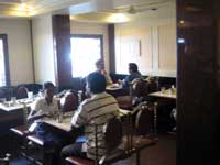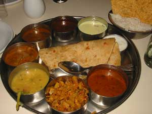 おすすめは「コーヒー・デイ」のカプチーノやエスプレッソ、いままでのインドの感覚では考えられないような、満足のコーヒーが飲めます。 それから、ずっと前から知ってはいたけど、いつも満員なので、ここのカレーは辛いだろうと勝手に決め込んでいた「ナブタラ・レストラン」で、最初ワダ・イドリというスナックを食べたら、以外や以外、そんなに辛くない。まじゅでも食べれる。 ということで、今日は、ここのターリー定食を試しにきました。おお、かなりいける! というかんじです。これなら、また食べにこよう。ダルスープ、辛すっぱい赤っぽいスープ、ヨーグルト、スイート、ドライとグレービーなカレー、全部で8品、チャパティが2枚にパパッドとライス。おかわり自由というシステムではないけど、もう十分でありました。これで60ルピー(約150円)は安い! マユールのターリー サハラのターリー アショクのターリー |